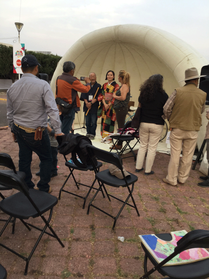 スタッフに案内された我々のパフォーマンス会場は、入り口に近く、幅、奥行きともに5メートルほどの、白い半円形の空気チューブでできた小さなものだった。その半円形の舞台に向かって折りたたみ椅子が並べられていた。舞台のテント地の床が汚れているので、エスパルタが汚れを落としていた。真ん中に自転車、荷台に紙芝居の演台を作る。