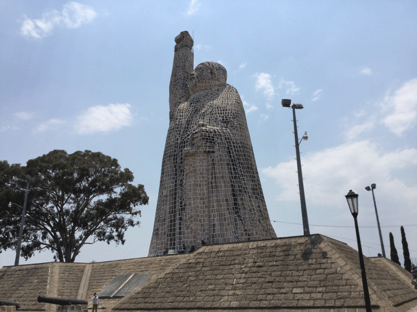 広場の中心に立つモレーロスの像の中に入った。英雄モレーロスの生涯や戦いを表す壁画が回り階段の階層ごとに最上階まで続いていた。最上階の細い螺旋階段を登りきると、四、五人も入れば満員になる狭い展望台だった。高い位置にある窓から眼下の風景を見下ろす。狭い突端にいるのを意識して尻のあたりがむず痒くなる。すでに親子連れががいて、さらに下から別の親子連れも上がってきたので、我々は早々と降りた。