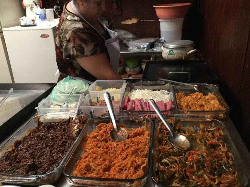 パツクアロのバスターミナルに着いて、徒歩でセントロへ。小広場に出る市場を通り抜け、屋根のある食堂街へ。最初に目についた「うまいゴルディタスとケサディーヤ」の看板のある店で、ケサディーヤを食べた。モレ、チキン、肉とピーマンの3種類。目の前のカウンターに具が並んでいるので注文しやすい。中年の銀髪の女性が注文を取りケサディーヤをその場で作る。横にスペイン人かと思わせる若い女性が何もせずに座っていた。その横には娘らしい女の子。練ったトウモロコシの生地を丸めて型で薄く伸ばし、熱した鉄板に敷く。焼き加減を見て具を入れる。その間、娘らしい女は何気なく前を見ているだけで、手助けするそぶりすらない。だが、出来上がったケサディーヤを皿に乗せ、玉ねぎ、チーズ、レタス、クリームを挟み込み二つに切る、というのがその女性の仕事だった。味は特に美味しいというわけではないが、まあまあだった。チョコレートのように見えるモレそのものの味については「これだ」という確信にまだ至らず。喉が詰まったのでジュースを頼んだ。瓶入りの桃ジュースだった。ビールは許可を取らないと販売できないと銀髪中年女性が言う。一つだけでも結構な量だった。二人で3つも食べたので大満腹だった。勘定は90ペソ(540円)。多分、ケサディーヤが1つ25ペソ、ジュースが15ペソという感じだろうか。
