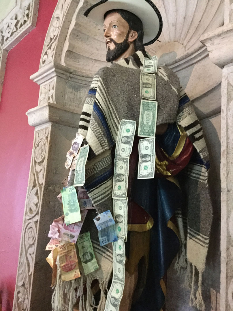 教会の中にも人々が大勢いた。帽子を被りポンチョを身につけた中央祭壇の壁のサン・フアン像にはたくさんのお札が貼り付けられていた。側廊には本体が隠れるほど花で飾られたマリア像もあり、雨でなければこの像を担いで街を回るのだという。ブラスバンドの鳴り物入りで担いでいる集団も見えた。