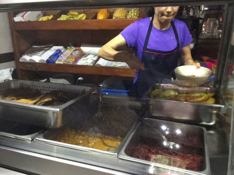 まず行ったのが、先日バチェたちにご馳走になった大広場に面したレストラン「El Asadero」。値段の割にクオリテイーの高いレストランだ。久代さんが豚肉の煮物、ご飯、サラダ、煮豆、ワダスが大きな唐辛子チレとひき肉を煮込んだスープ状のものとご飯、サラダ、煮豆の定食。一人90ペソ。「美味いなあ」と言いつつ食べていると空が暗く怪しくなり、今にも雨が来そうな天気になつた。雨が降り出すところまで歩こう、ということで坂道を降りる。ホデガ・スーパーまでは雨に当たらずに済んだ。スーパーで、明日のお呼ばれ用のワイン、お菓子、菓子パン、パパイヤ、ビール6本、ミルクを購入。298ペソ(1788円)。