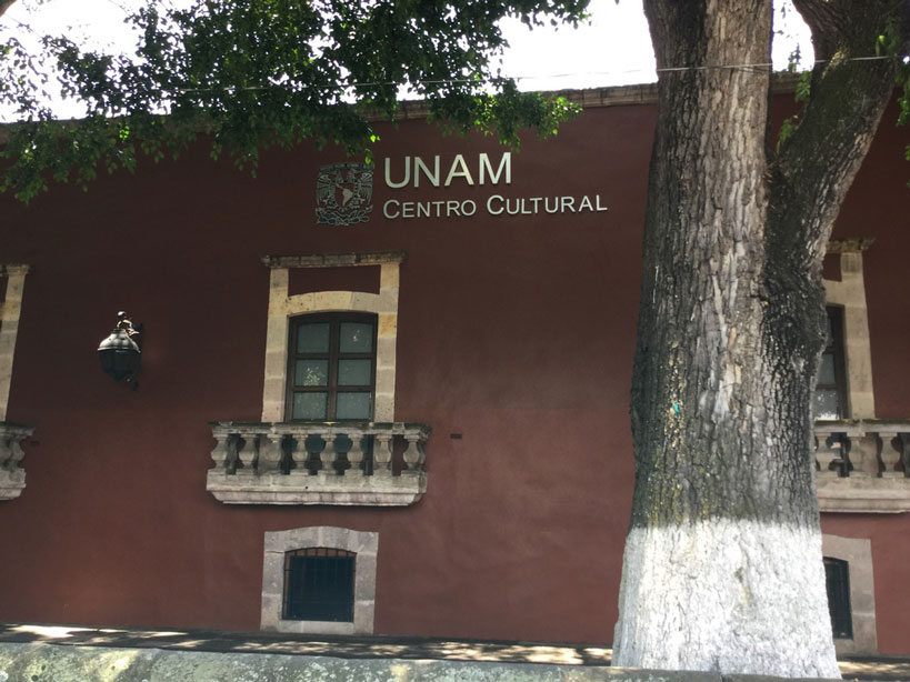 「ここは12月になると、向こうに見えるグアダルーペの処女マリアの教会Santuario de Nuestra Señora de Guadalupeへ向かって人々が膝を折って祈りながら進むんだ。その横に見えるのがメキシコ国立自治大学UNAM(Universidad Nacional Autónoma de México)の文化センター。グアダルーペの処女マリア教会の中に入りますか? 中は金で装飾されている。その横は今は法律学校になっている」