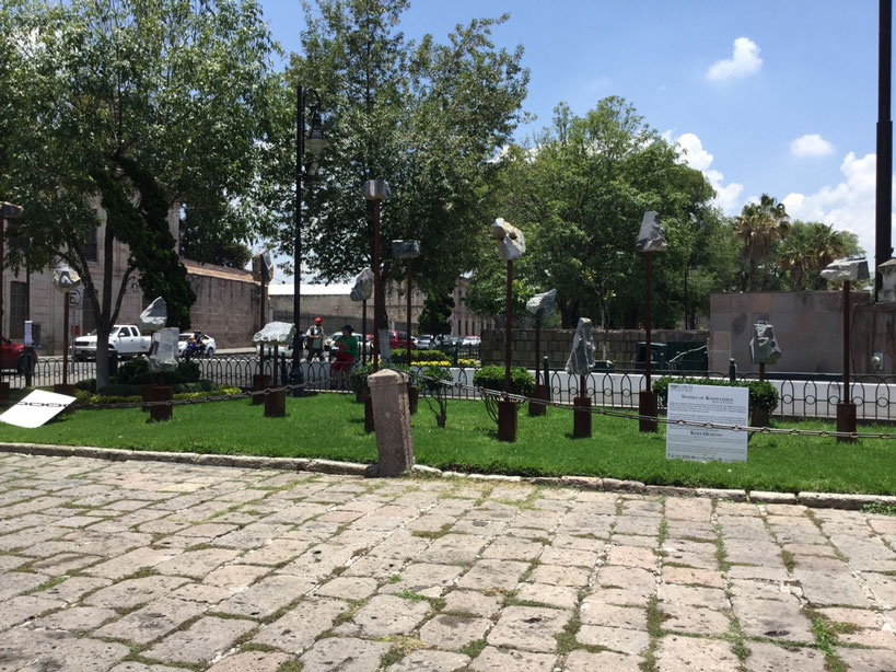 グアダルーペの処女マリア教会の前の広場に面した広場には、細い鉄柱の上に石を乗せた美術作品が展示中だった。広場の角にあるカフェ・オリゴOrigoでビールを飲みつつ一服した後、エステバンのアパートへ。