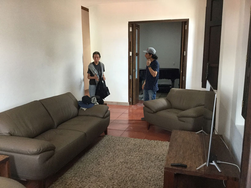 アパートはセントロからゆるい坂を下った通りの角にあった。カテドラルから歩いて5分ほどだ。住み始めてまだ2ヶ月という。真新しい白い壁の2階建の上が彼の住居になっている。木製の頑丈なシャッターの出入口から入ると、職人が作業中だった。「まだ色々手直しが必要なんだ。雨漏りも直さなきゃダメだし」とエステバン。