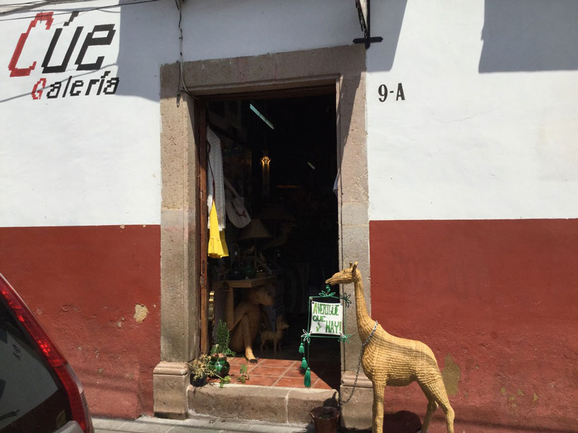 大広場を歩いているとプリシリアーノの車が通りかかり手を振った。アリシアの友人リナの店「クエCúe」の写真を撮った。リナはいなかったが、店番の若い女性がいた。入り口にリナの元夫マリオの作品が飾ってあった。乾燥した葦を組み合わせたキリンの造形が見事だ。店内にもマリオの大小の作品があった。エリカの作ったバッグも見えた。