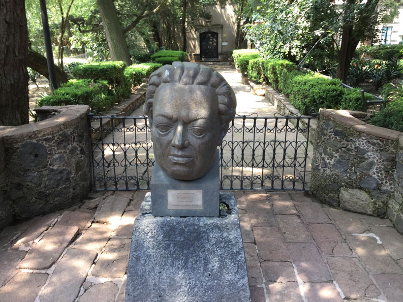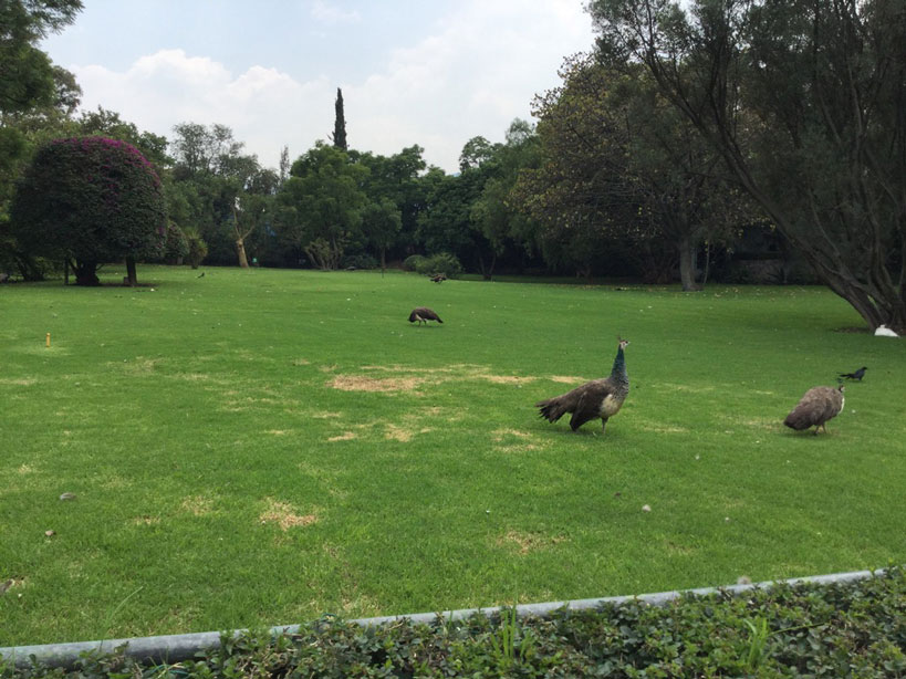 リュックをクロークに預けて見事な庭園に入った。孔雀がそこらじゅうにいた。さらに濃い灰色の毛のないつるんとした犬が十数匹動き回っていた。犬を見ていた女性に「これってコヨーテ? それとも犬?」と聞くと「犬よ。フリーダとディエゴが飼っていた犬の子孫なの」と言う。案内板によれば、有史以前からメキシコに生息していた絶滅危惧種の無毛かつ一部の歯のない犬とのこと。その1匹が、彫刻の犬の横でポーズをとっていたのがおかしい。