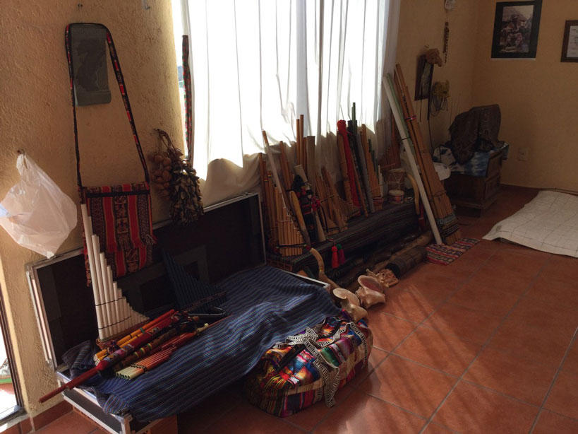 舞台袖ではメガネをかけた長身の中年男セルフィオがマイクとスピーカーを準備してくれた。マイクはワイヤレスだったので洗濯バサミにくっつけ、それをバーンスリーの歌口に近い端に固定した。リバーブはなかったが、出力は問題なさそうだ。短いバーンスリーではマイクは使わないことにした。アルゼンチン出身のセルフィオはこのコミュニティーに住む住人で、普段は人形劇をやっているという。