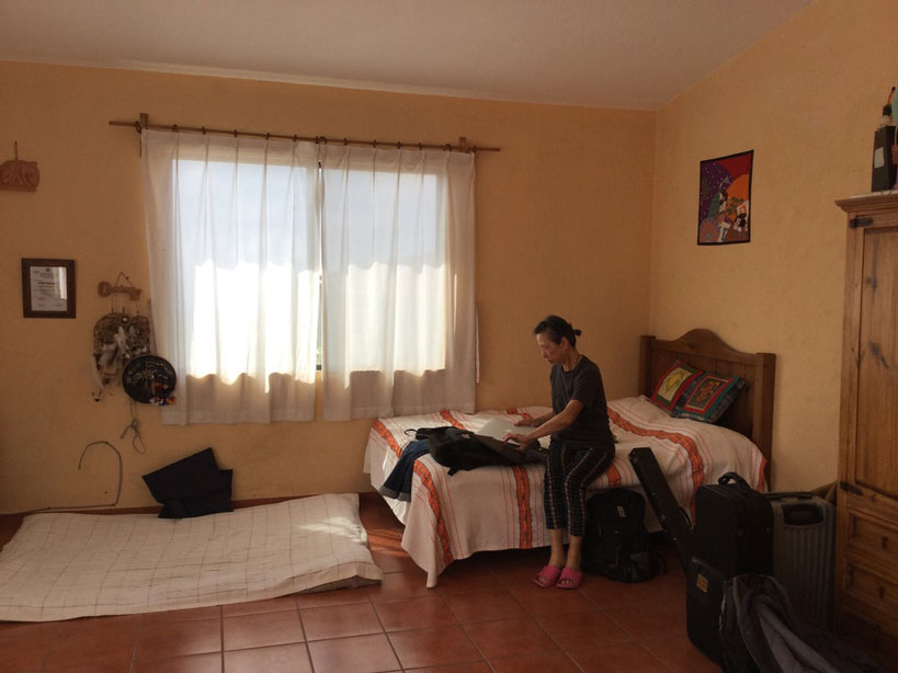 8時過ぎに1階におりて慶子さんにコーヒーを作ってもらう。ラウルはパジャマ姿でウロウロしていた。鍵をどこかに置き忘れたらしい。「探し出すまで何もできない人なの」と慶子さん。部屋から現れた陽一君が皿のリンゴを掴んで部屋に戻り、また戻ってきてさらにリンゴを掴んで食べながら再び部屋に戻る。9時になり、高校の入学式があるという慶子さんを見送り、我々もテポストランに帰る準備する。我々の泊まった2階の部屋と隣家の写真を撮った。楽器などが壁際にならんでいる。机の上には勾玉もあった。慶子さんのバンド名なのだ。