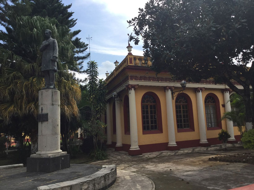 食事後、サマディが周辺を案内してくれた。野菜や果物、薬草、蜂蜜、雑貨の店が並ぶ市場など。ベージュ色の壁面に青緑色の縁取りのあるファティマ教会では少女が15歳になった祝いの儀式をやっているらしかった。ある建物の中庭では小さなテーブルに商品を並べた民芸品が売られていた。入り口にヘビをかたどった石の彫刻があった。台座にはCoatepekとある。この町の名前はヘビCoaの丘tepekからきたとのこと。