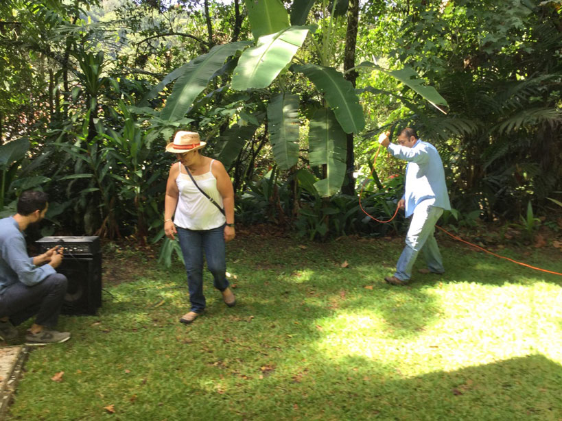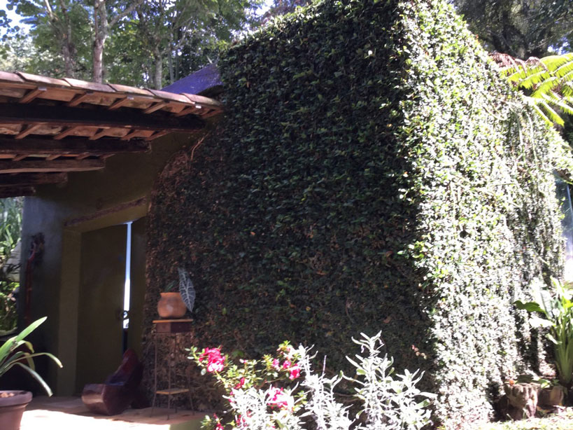 ほどなく目的地のレストランAlimentos de Raiz(そのまま訳せば「根っこの食べ物)に着いた。狭い道の路肩に「ヨガ、ベジタリアン食堂、エアーB&B」の表示。鎖だけの門を入って駐車した。すでに多くの車が駐車していた。鬱蒼とした木々やバナナ、パイナップルなどの果樹、シダ類の間の階段を上ったところがレストラン兼アルマンド夫妻の住居だった。アルマンドは建築家、ジャンタルはヨーガの先生をしている。二人には1歳ちょっとの娘スィアナがいる。