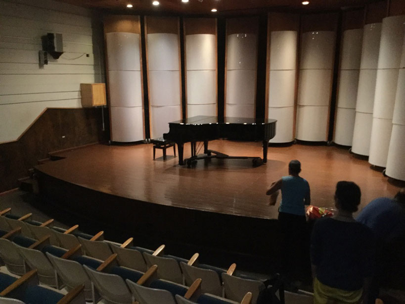 案内されたのは客席が急な階段状になった小さなホールだった。舞台にはグランドピアノが置かれていた。ピアノを背にして音を出してみたが、やはりPAは必要なようだ。サマディの用意した長いクッションに座り、マイクスタンドやスピーカーの音量を調節していると、アルマンドが平台を持って現れた。その平台にやはりアルマンドの持ってきた布を敷き、その上にクッションを乗せる。
