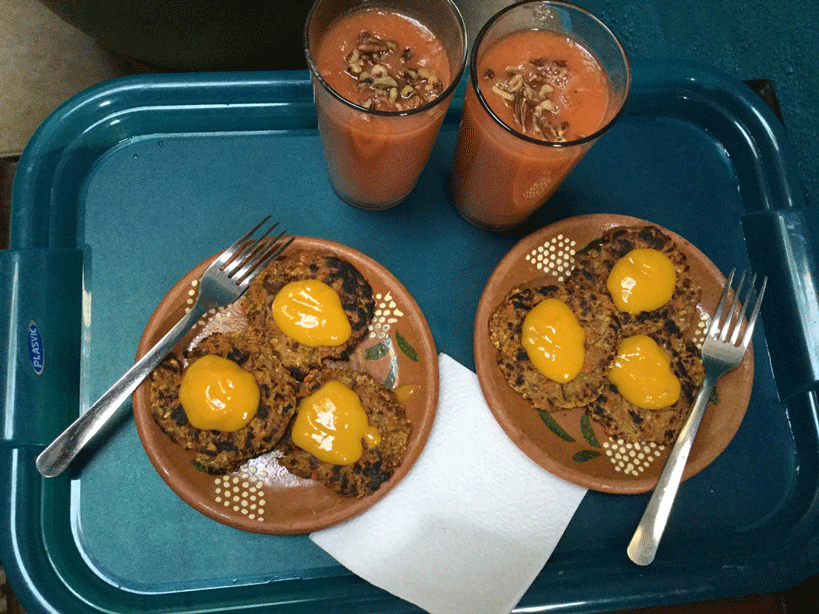 注文したのは「今日の定食」120ペソ。スープSopa MexicanaまたはサラダEnsalad de germinado、チーズソースで和えたマカロニMacarrones con quesoまたは中に牛肉とチーズの具の入ったパイ状のカルツォーネCalzone、フライした魚のニンニク炒めPescado al ajillo または牛肉と野菜炒めAlambre de res、小さなイチゴ味のケーキ、コーヒー。二人なので「または」なしで全て注文しお互いに交換して食べた。どれもなかなかに洗練された味で悪くない。これで120ペソは高くはない。