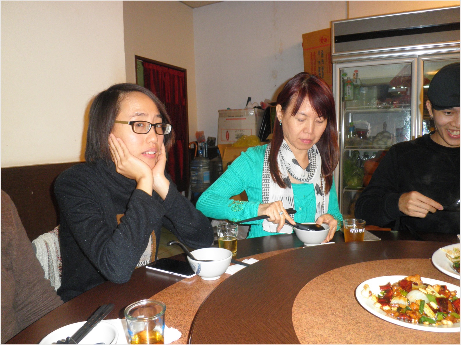 われわれは奥の丸テーブルに座った。エミリーが勝手に冷蔵庫から出してきたビールとお茶で乾杯。ラン、フェイフェイ、一休さん、シンちゃん、もう一人青年シンジが加わった。カキフライ、蒸しレモンフィッシュ、麻婆豆腐、地元野菜の炒め、焼き飯、牛スープ、ゴーヤ炒めなどなどがテーブルに並んだ。どれもとてもおいしい。