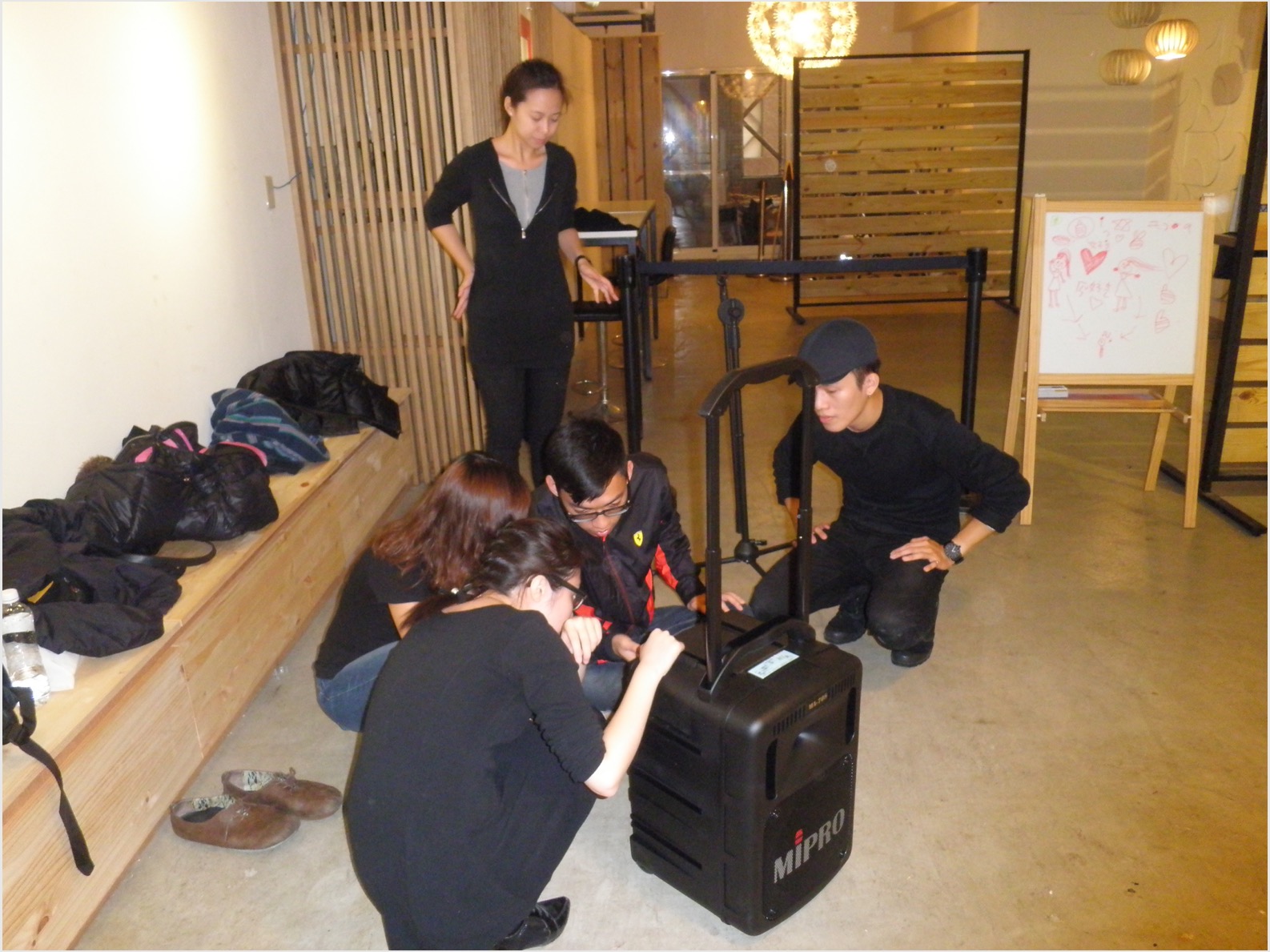 スピーカーがようやく息を吹き返し、ドリスが数少ない客席に向かってアナウンスを始めた。しかし、あまりに条件が悪い。ワダスは控室に使っている2階でやろうと提案した。スタッフたちが大忙しで会場を整えた。お客さんは10名ほどだろうか。