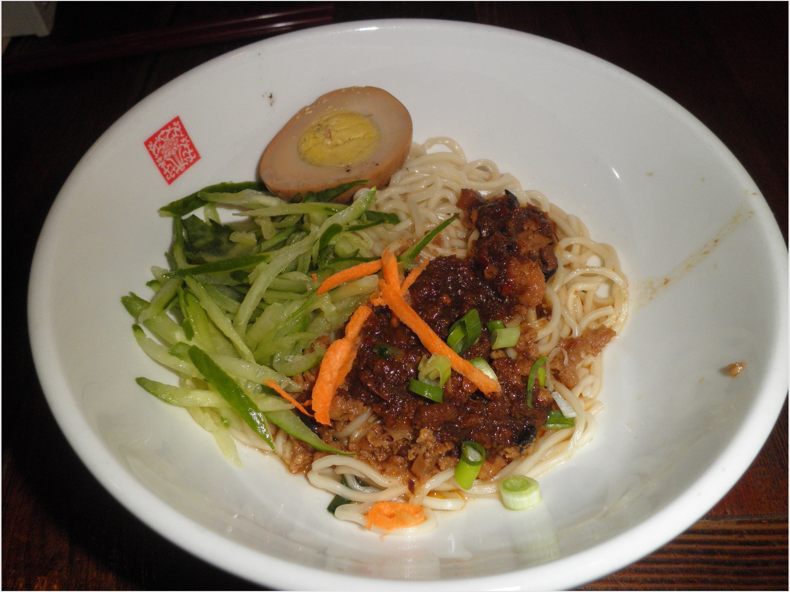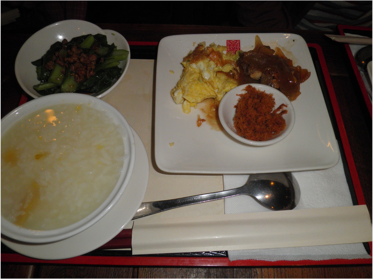 遊歩道のある商店街の端にあった茶店の2階で朝食。ワダスは激辛炸醤麺、角、東野、白井はおかゆ定食。炸醤麺は、ま、普通の味だった。