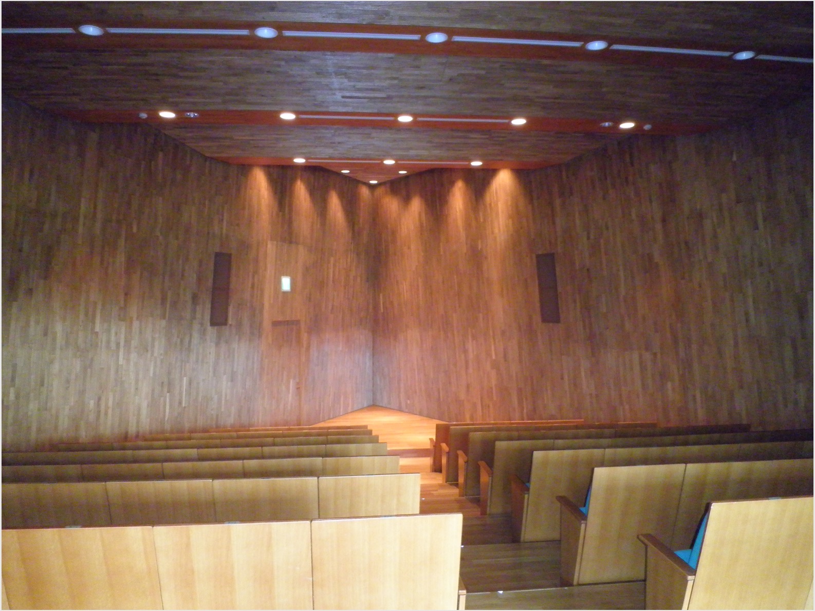 天井、床がすべて木壁の三角形の講義室はキリスト教会のように見える。