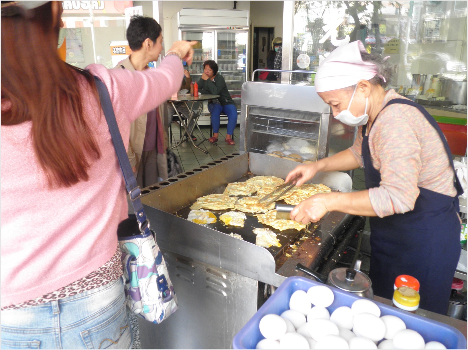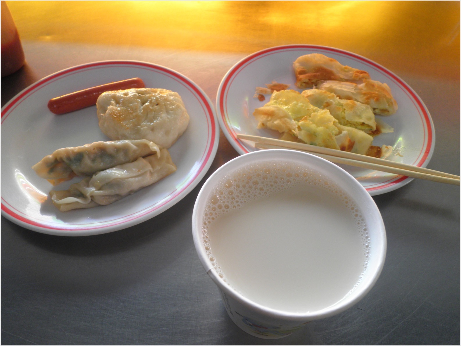 ランは「燕笙豆奨」という街角の食堂へわれわれを案内した。陳列棚に並んだ餃子、マントウ、ソーセージ、オムレツ包み、豆乳などを好みで皿にとるスタイルだ。入り口の前では中年女性が薄く伸ばした小麦粉の上に卵をのせて焼いていた。壁にずらっとメニューが並んでいたが、どれもとても安い。
