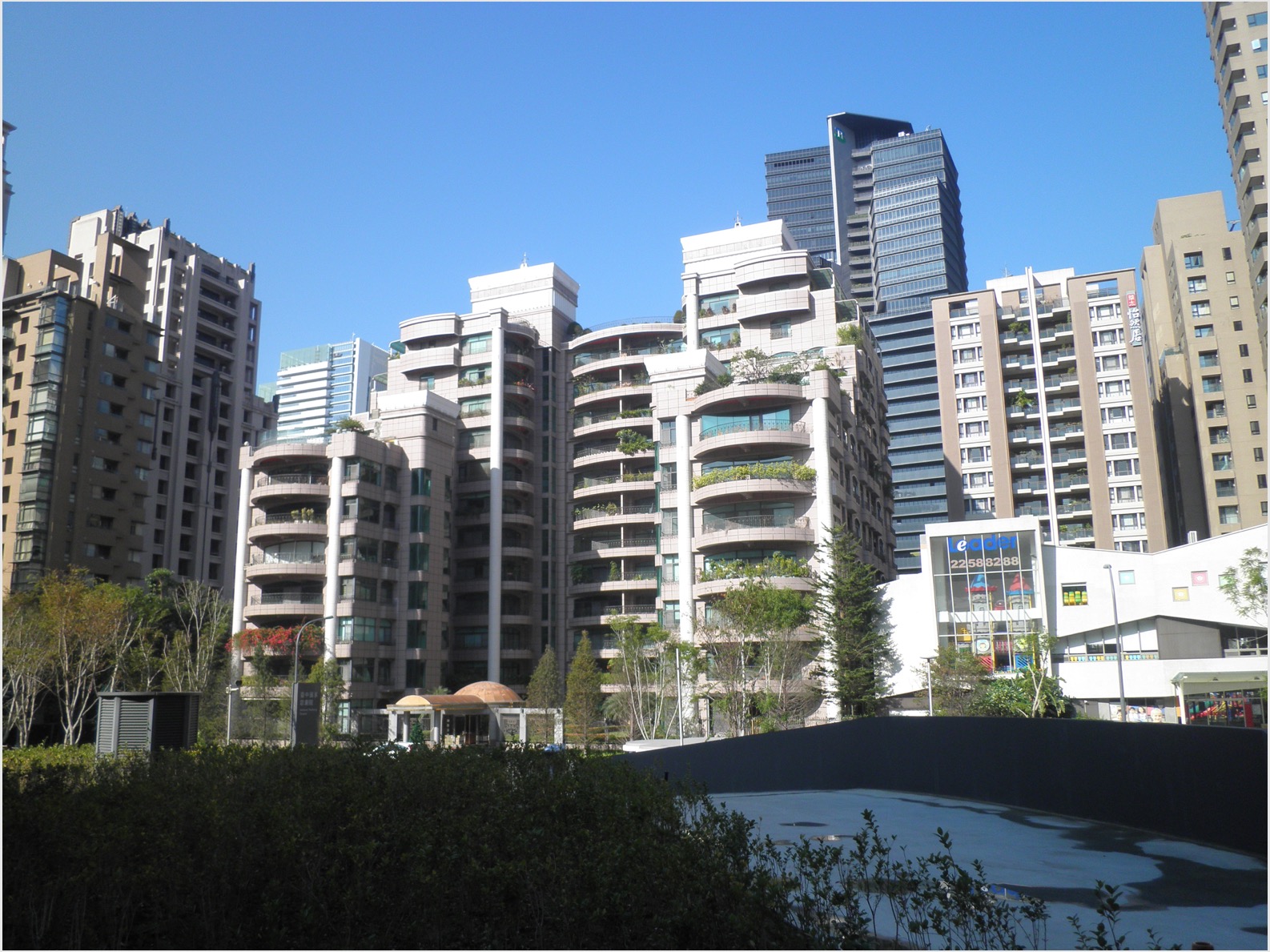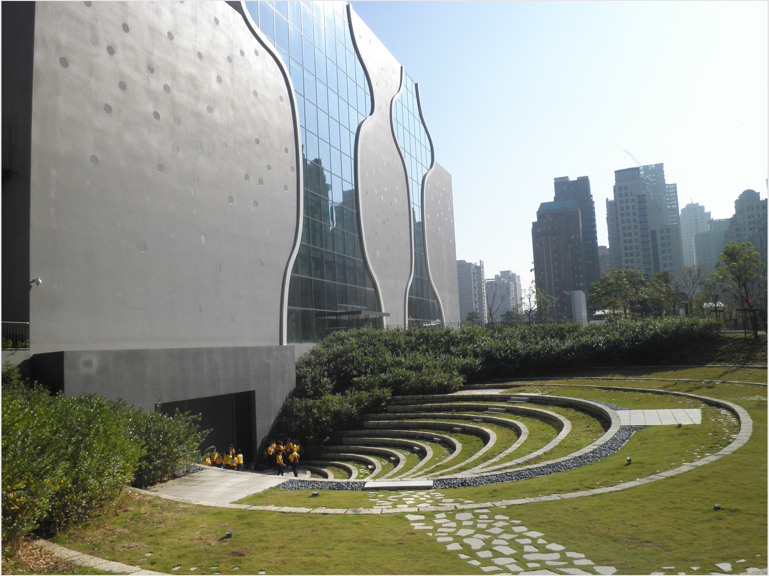まず、伊東豊雄設計で話題の台中国立歌劇院へ行った。周辺が超高層のビルで囲まれた区画にあり、遠くからでもすぐに分かるほど特徴的な外観だった。すっきりしたガラスの直線とぐにゃっとした灰色のコンクリートの壁面のコントラストが印象的だ。正面広場の楕円形の浅い凹みにうっすらと水が張ってあり、その水面に外観が反映して美しい。未完成の屋内に入ることができないので、外周を回った。コンクリート壁面の一部やガラス面に汚れが見えた。ランは、本来なら1年前にできているはずが市政方針の変更が続き開館がいつになるかわからないという。イベントの告知ポスターがあったが、よく見ると屋外で開かれるものだった。