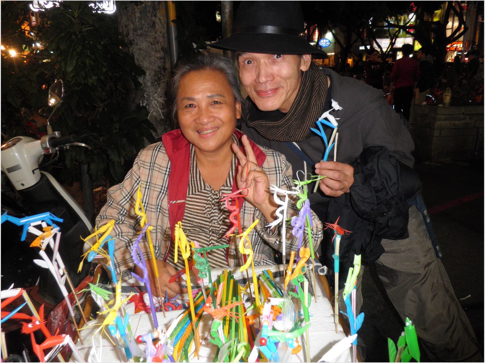 電動車椅子に座り、発泡スチロールに突き刺したストロー細工を売るオバサンがいた。普通のストローに別のストローを切ったり曲げたりして作ったトンボや芋虫のような昆虫、龍などをはめ込んだ単純なものだ。誰が買うんだろうと思ったが、たまにお客が来て買っていく。角がどういうわけか一つ150元で買った。売っている女性はオバサンというよりも婆さんにも見えるが、年齢はわれわれくらいかもしれない。彼女はいろいろ質問を受けて機嫌良さそうだ。角とのツーショット記念写真を撮った。彼女が写真を欲しいというので、エミリーにメールで送ってプリントアウトしてもらおう。
