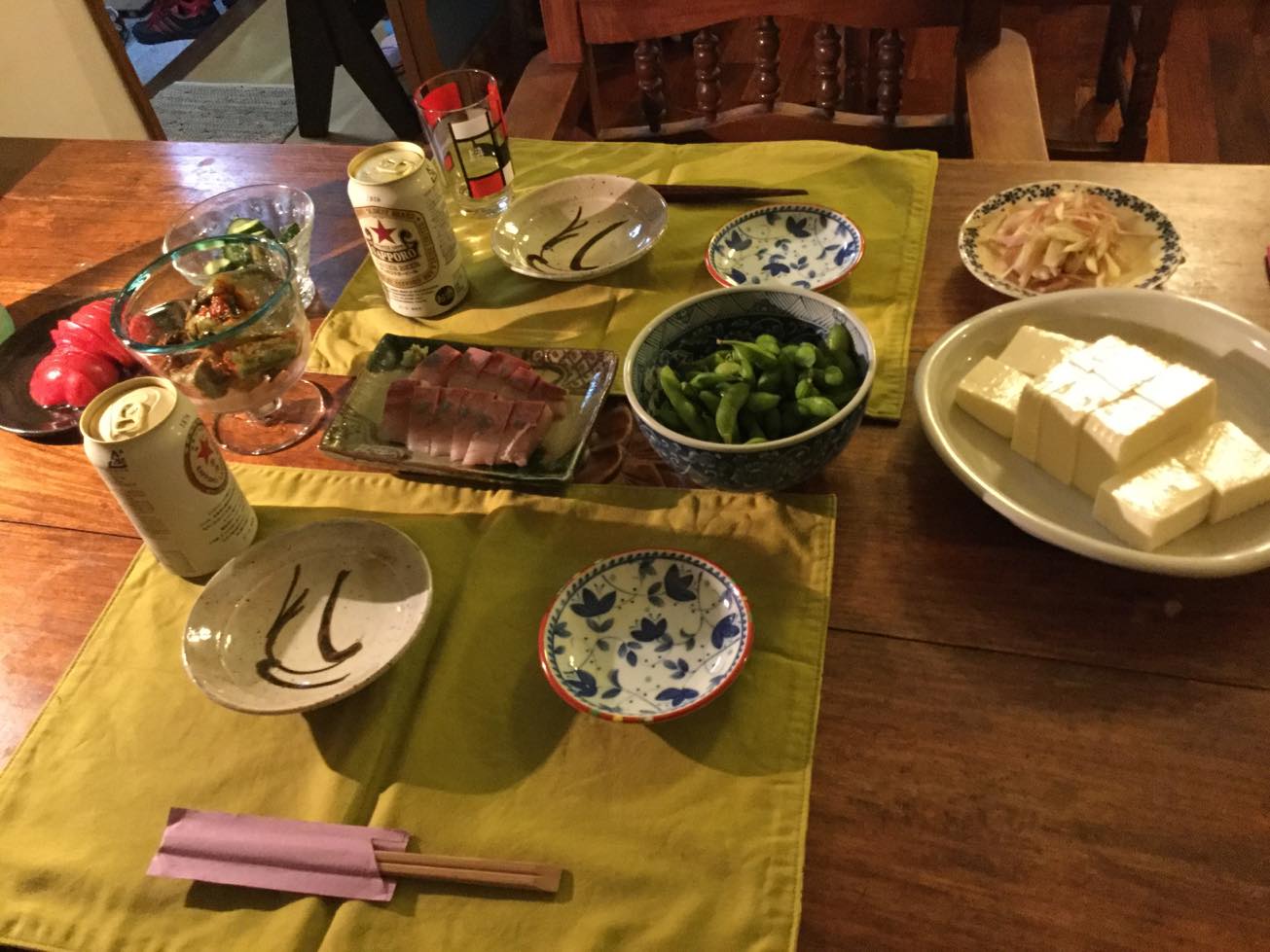 大病になり現在は体力回復中だというエッチャンの手料理と滋賀県の地酒を飲みながら、この家のこと、二人の馴れ初め、聡史さんが最近ボストンに行って3キロ太ったとか、物語を書くのに最近はまっているというエ