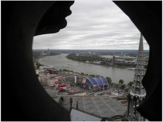 ようやく最上部に到達した。尖塔の突端部分だ。遥か下に広場、駅、町並みが見下ろせた。尖塔を中心とした狭い廊下沿いにぐるっと巡る。どんよりとした曇り空の下に蛇行する大きなライン河が見えた。なだらかな起伏が地平線まで広がっていた。発電所の、真ん中のすぼまった円柱形をした大きなコンクリート冷却棟が3棟並んでいるのが見えた。原発だろうか。